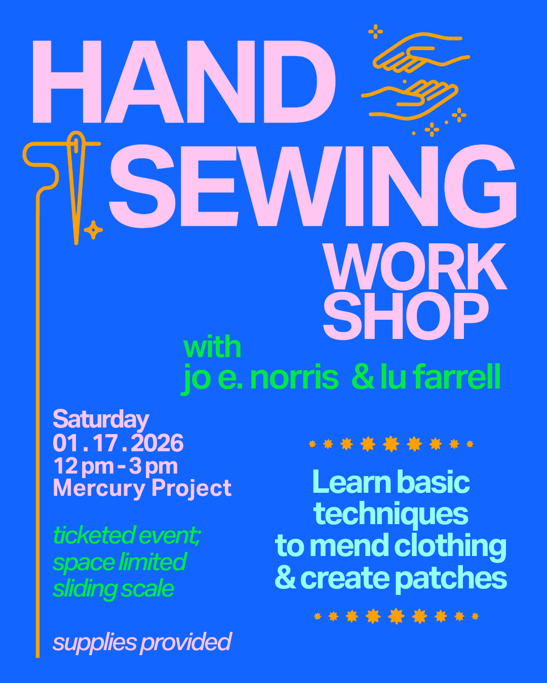 Jan 17 12:00 PM12:00 Hand Sewing Workshop Saturday, January 17, 2026 12:00 PM 3:00 PM 12:00 15:00 Google Calendar ICS View Event →