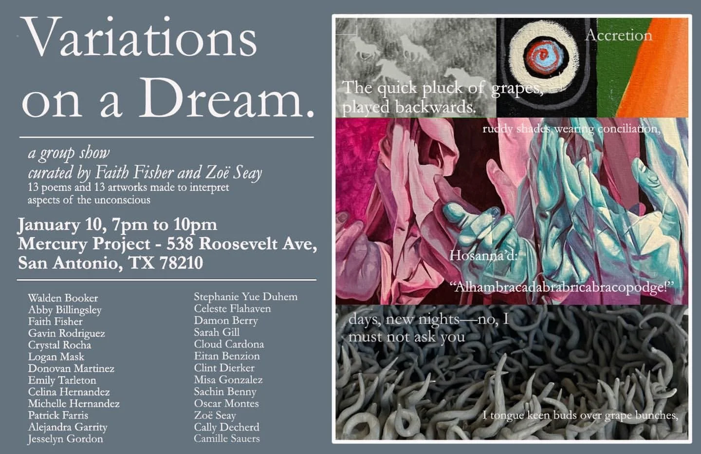 Jan 10 7:00 PM19:00 Variatons on a Dream - Group Exhibition Saturday, January 10, 2026 7:00 PM 10:00 PM 19:00 22:00 Google Calendar ICS View Event →